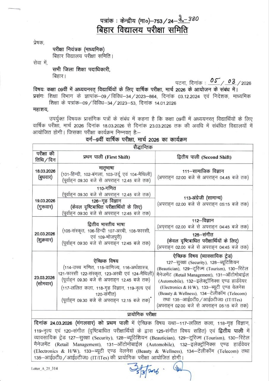 Bihar Board 9th Annual Exam Routine 2026 Click Here